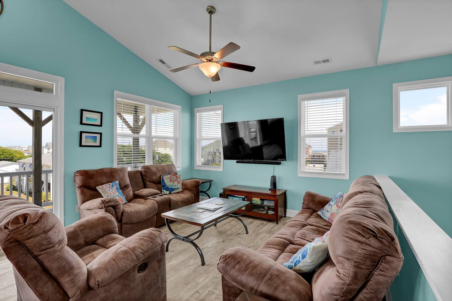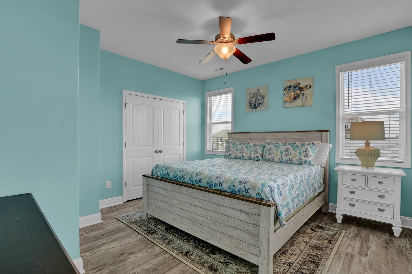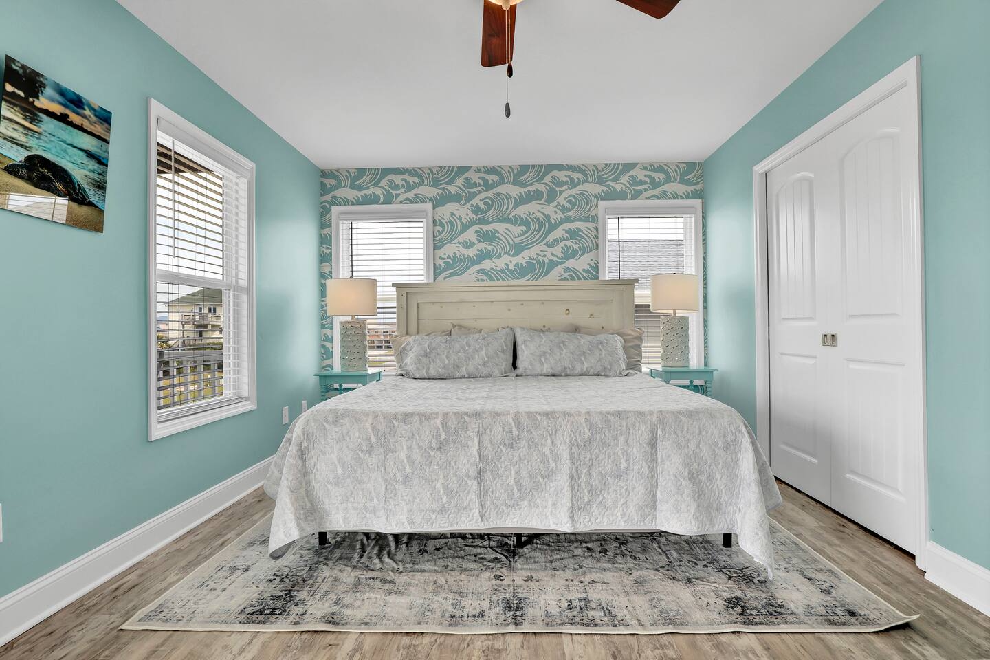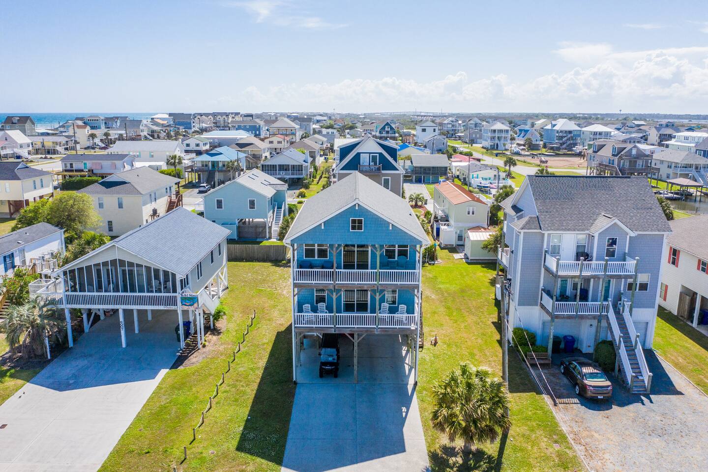 The Tip-Sea Turtle is a stunning 4BR, 3BA pet friendly beach home with 4 decks offering ocean and sound views on every level, a reverse floor plan, and two master suites. Perfect for families or groups. Located in the heart of Surf City, just a short walk to the beach, bars, and restaurants. Enjoy the 6-seater golf cart (extra fee), grilling, cornhole, and relaxing on spacious porches. The perfect coastal escape with room for everyone!
