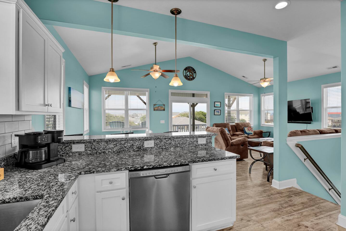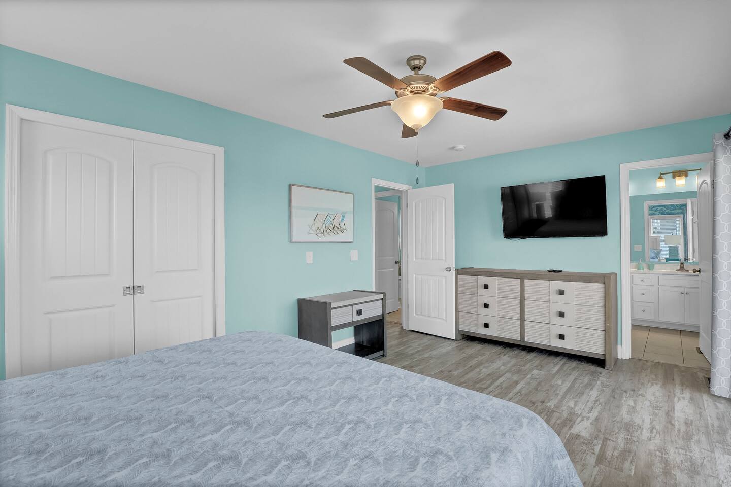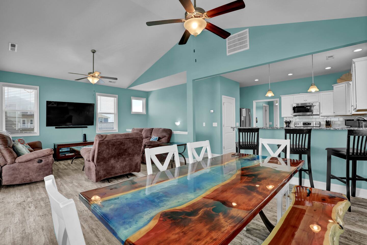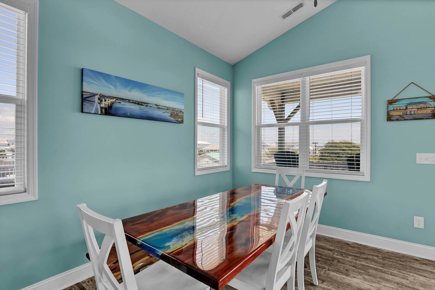 The Tip-Sea Turtle is a stunning 4BR, 3BA pet friendly beach home with 4 decks offering ocean and sound views on every level, a reverse floor plan, and two master suites. Perfect for families or groups. Located in the heart of Surf City, just a short walk to the beach, bars, and restaurants. Enjoy the 6-seater golf cart (extra fee), grilling, cornhole, and relaxing on spacious porches. The perfect coastal escape with room for everyone!