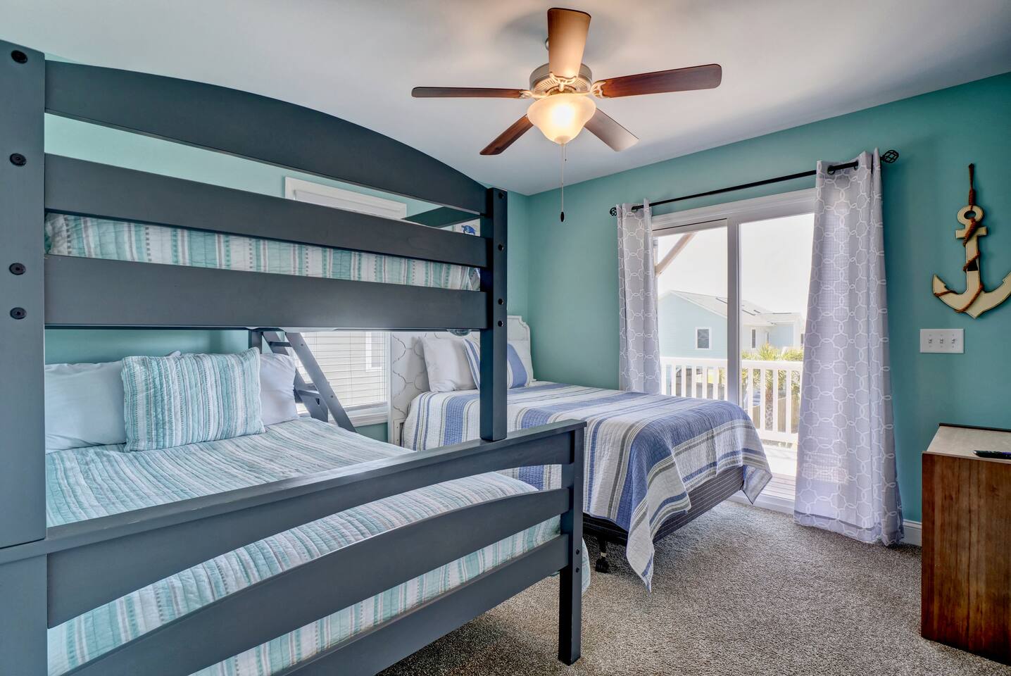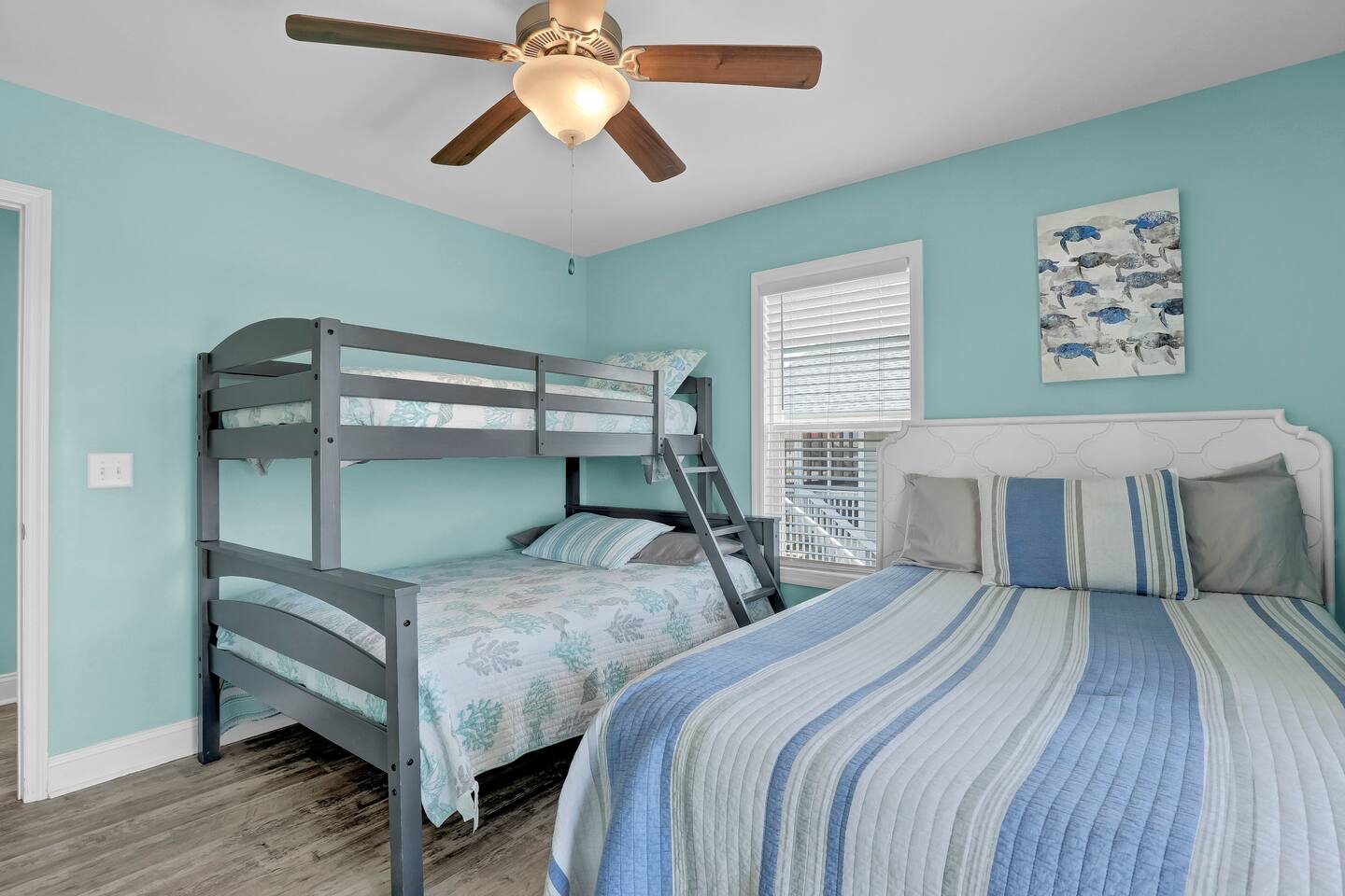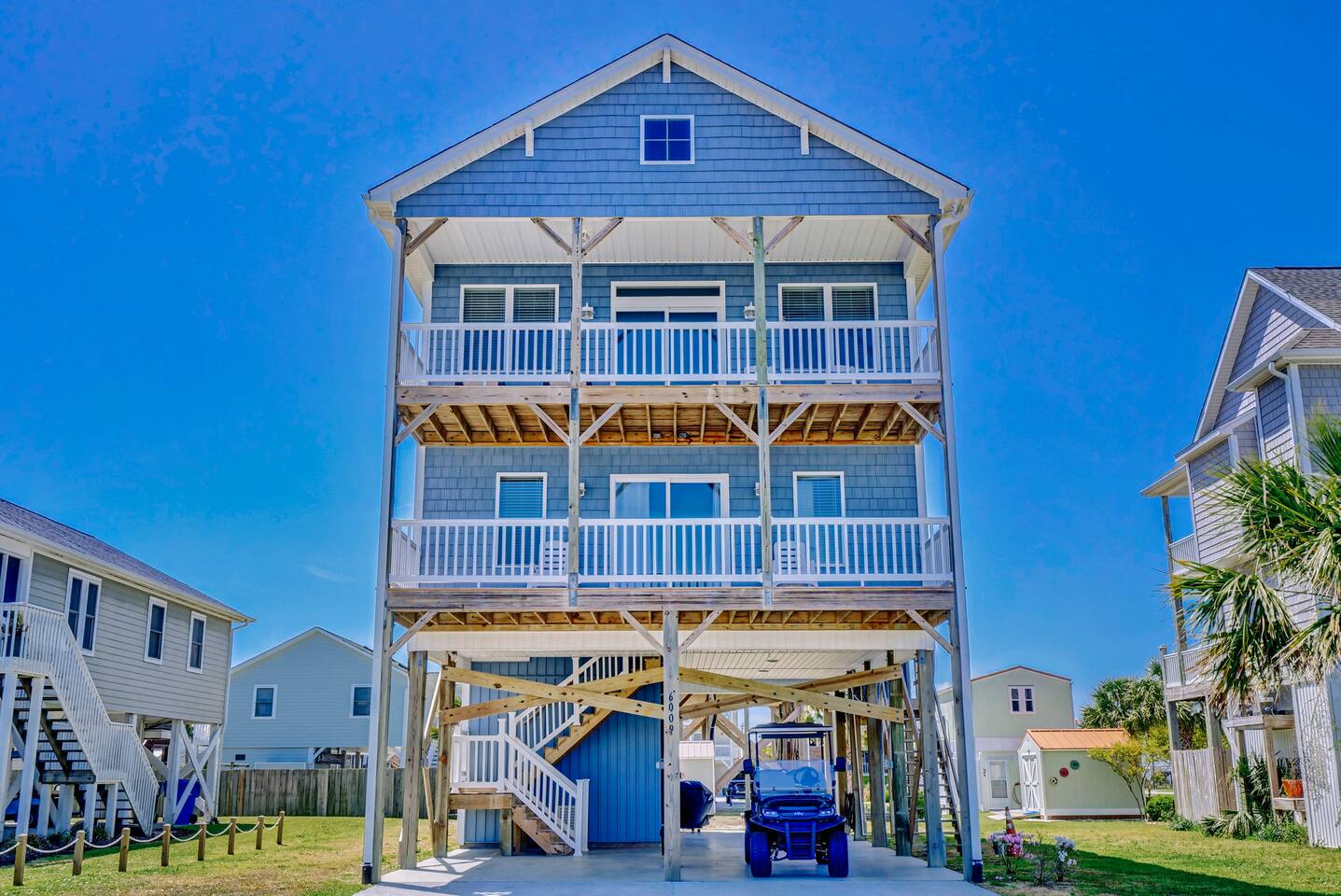 Topsail Turtle Properties! Located in the heart of Surf City, equal distance between the ocean and sound. Sip coffee in the morning on the front or back porch and enjoy the evenings grilling under the house throwing cornhole. Dog-friendly (pet fee $35 per day sent separately from the initial booking). The brand new lithium 6-seater golf cart is available to rent for an additional fee. Free beach parking with the cart! Weekly Rate $425. Less than 7 nights booking $60 a day. BEDROOMS: ★ Primary bedroom 1st floor -King bed with private bath- Roku TV in room ★2nd bedroom -Queen bed with shared bath- Roku TV ★ 3rd bedroom "bunk room" Two full size beds and 1 twin bed- Shared bath- Roku TV ★ 4th bedroom (Upstairs)- King bedroom- 2nd floor- Private bath- Roku TV Our Linen Services includes towel sets for every guest. All beds are made up prior to your arrival (sheets/comforter/pillows). AMENITIES: ★ Cruise around on the 6-seater golf cart (extra fee) ★ Pet Friendly ★ Outdoor shower ★ Every bedroom has a private deck ★ Cornhole and beach games provided ★ Gas Weber grill KITCHEN: Fully equipped with everything you need to cook your own meals. A Keurig and regular coffee pot are available. We provide a starter kit of K-cups, sugar and creamer. OUTDOOR SPACE: Enjoy the shaded outdoor space under the house. Perfect for grilling on the gas weber grill in the evenings. Outdoor picnic table and fold out chairs for sitting. There is a large storage closet with beach chairs, umbrellas, cooler, beach toys and games. A wagon is supplied to pull the beach items to the access just a short walk away.